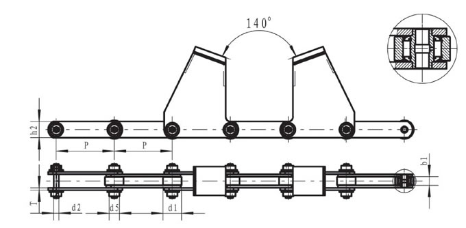 | Chain no. | Pitch P (mm) | Inner width of inner link b1 (mm) | Diameter of roller d1 (mm) | Diameter of pin d2 (mm) | Height of sidebar h2 (mm) | Thickness of sidebar T (mm) | Diameter of outer roller d5 (mm) | Tensile strength Q (KN) |