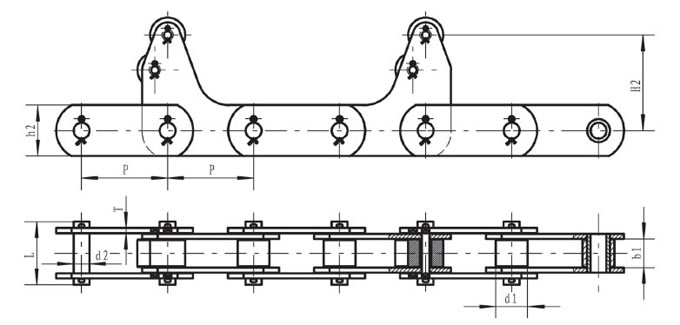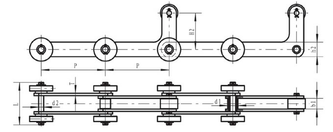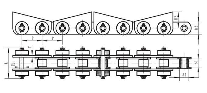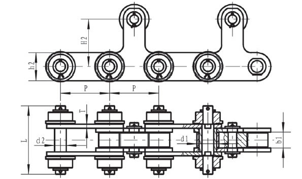 | Pitch P (mm) | Inner width of inner link b1 (mm) | Diameter of roller d1 (mm) | Diameter of pin d2 (mm) | Length of pin (mm) | Height of sidebar h2 (mm) | Thickness of sidebar T (mm) | Height of top chain H2 (mm) | Tensile strength Q (KN) |