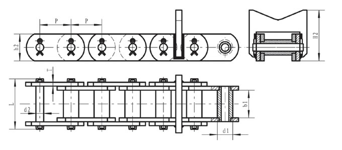 | Pitch P (mm) | Inner width of inner link b1 (mm) | Diameter of roller d1 (mm) | Diameter of pin d2 (mm) | Length of pin L (mm) | Height of sidebar h2 (mm) | Thickness of sidebar T (mm) | Height of top plate H2 (mm) | Tensile strength Q (KN) |