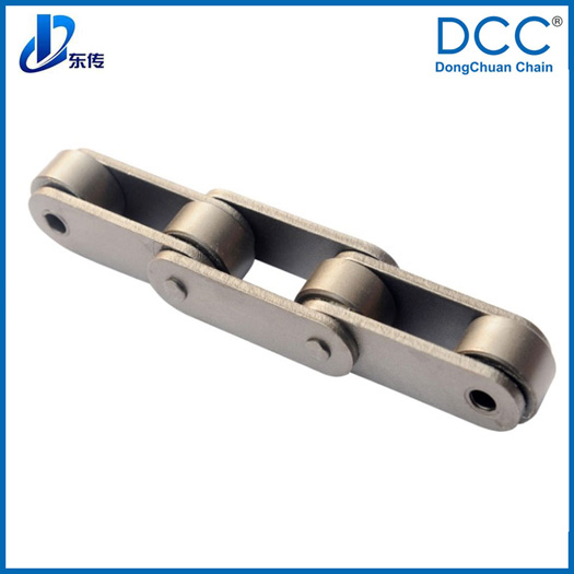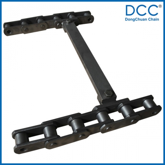 鏈條主要用于工程機械,鋪路機使用,鏈條為雙排鏈,在兩鏈條間裝配刮板,我們在裝配刮板的部位采用焊接工藝,并在鏈板中間沖定位孔,焊接附件用油壓機壓入鏈板后再進行焊接,增強附件的焊接牢固度,中間的刮板用中碳鋼熱處理,使刮板強度更高,更耐磨。并用平面磨床磨平刮板的兩平面,減少鏈條與設備間的間隙,通過以上這些工藝措施,鏈條的使用壽命得以大大的提高。