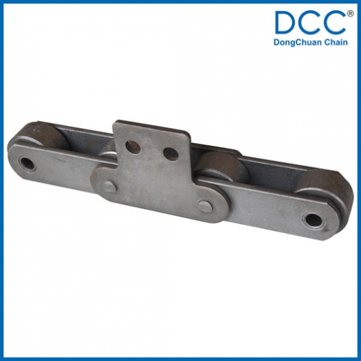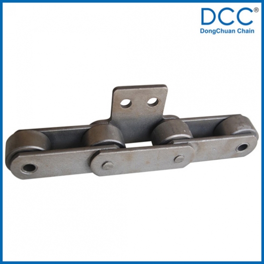 | pitch P (mm) | Inner width of inner link b1 (mm) | Diameter of pin d2 (mm) | Diameter of roller d1 (mm) | Height of sidebar h2 (mm) | Thickness of sidebar T (mm) | Pitch of attachment L (mm) | Central distance of attachment L1 (mm) | Hole diameter of attachment d4 (mm) | Height of attached side plate h4 (mm) | Tensile strength (KN) |
