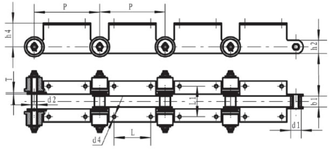 | Pitch P (mm) | Inner width of inner link b1 (mm) | Diameter of pin d2 (mm) | Diameter of roller d1 (mm) | Height of sidebar h2 (mm) | Thickness of sidebar T (mm) | Pitch of attachment L (mm) | Central distance of attachment L1 (mm) | Hole diameter of attachment d4 (mm) | Height of attached side plate h4 (mm) | Tensile strength (KN) |
