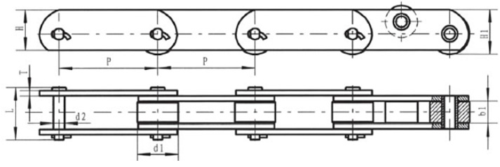 | Pitch P (mm) | Inner width of inner link b1 (mm) | Diameter of pin d2 (mm) | Diameter of roller d1 (mm) | Height of sidebar h2 (mm) | Thickness of sidebar T (mm) | Length of pin L (mm) | Height of chain h1 (mm) | Tensile strength (KN) |