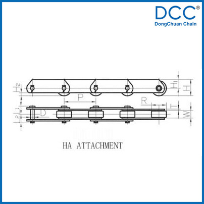 | Chain No. | Roller type | Pitch P (mm) | Inner width of inner link W (mm) | Diameter of roller R (max) (mm) | Height of chain H (mm) | Data of sidebar | Data of pin | Tensile strength Q (KN) | |||||